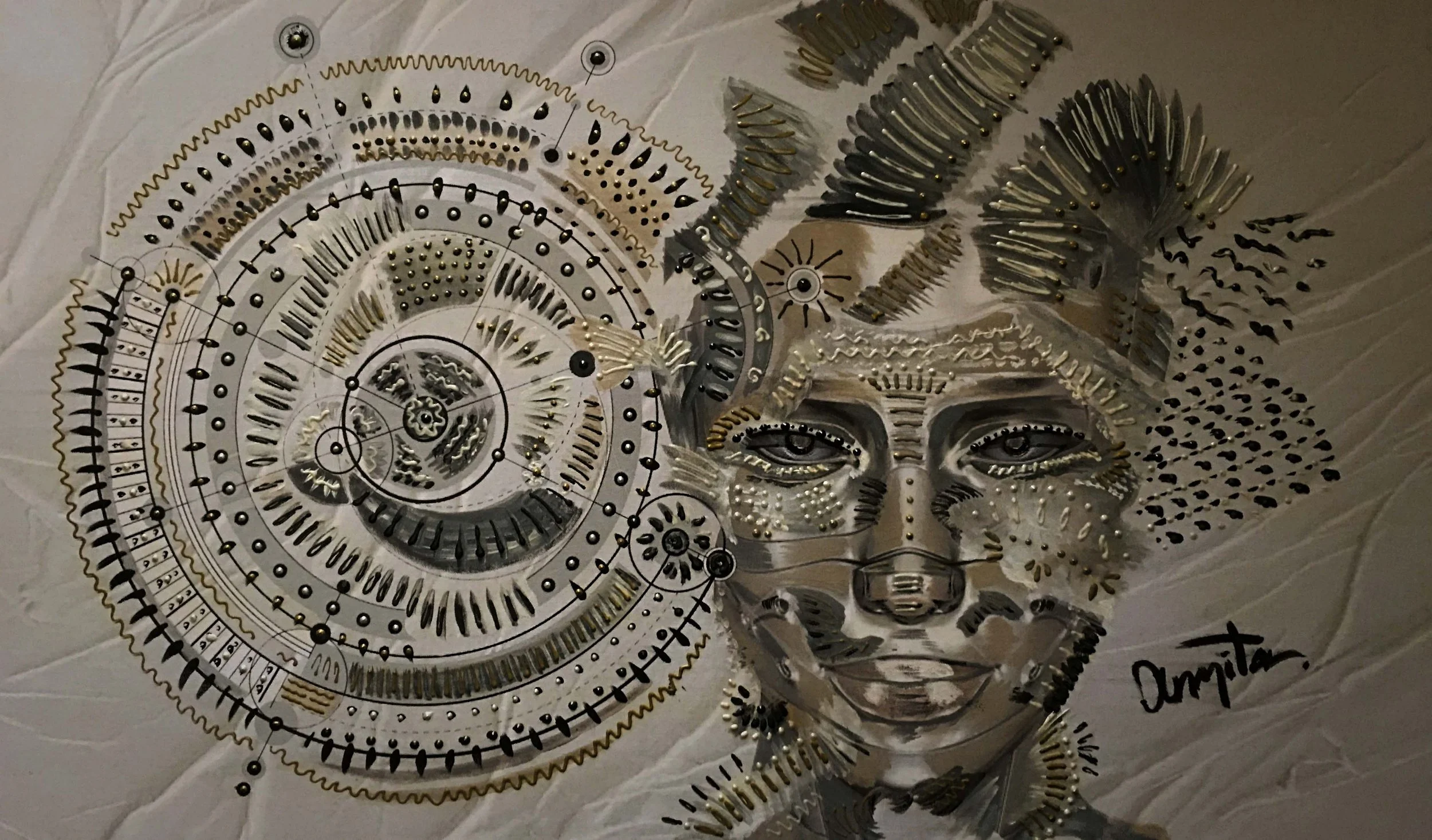 Materials: White canvas printed with original digital composition, fully transformed with acrylics