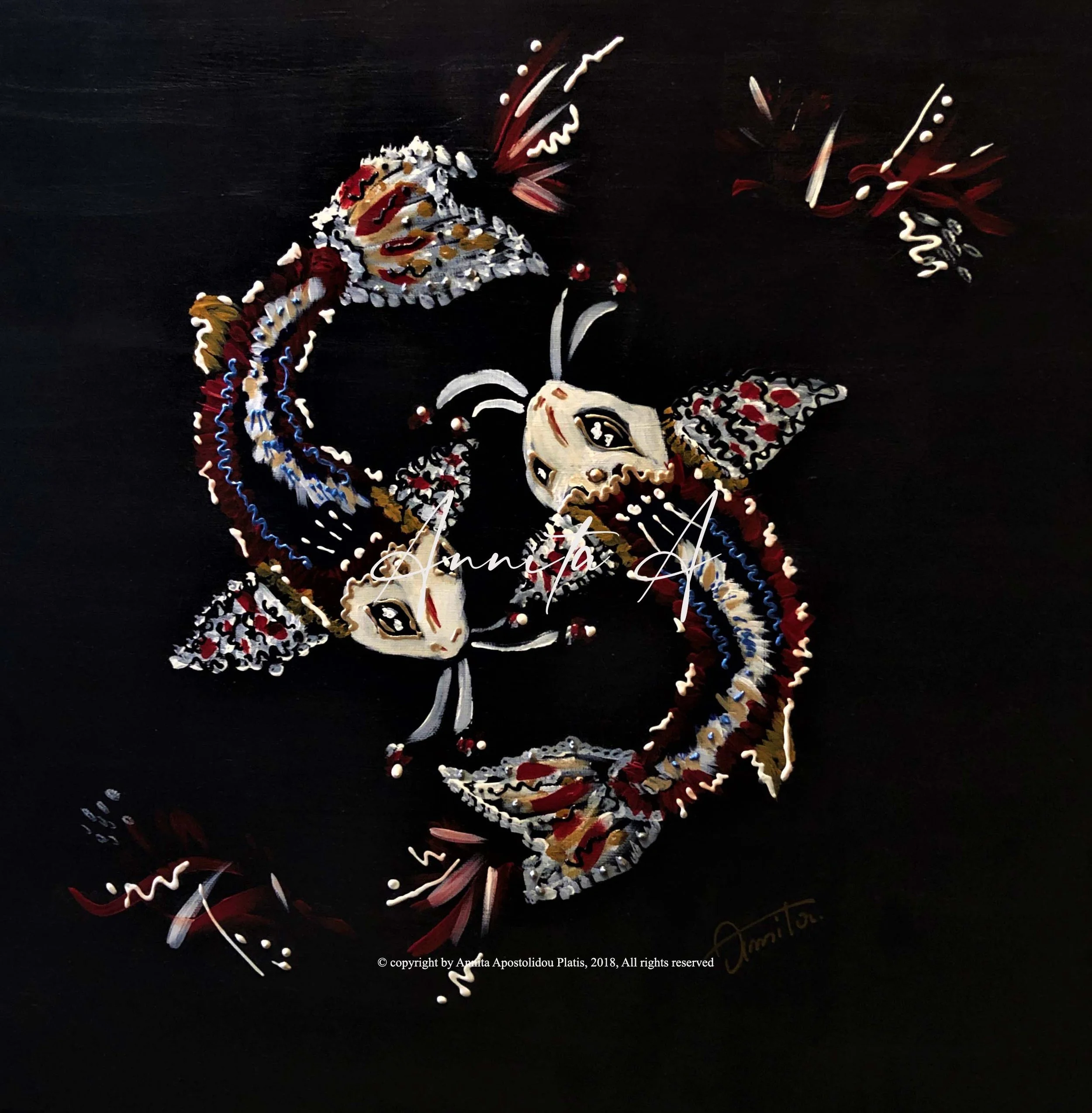 Σε έναν μαύρο καμβά, απεικονίζω τα ψάρια koi συνυφασμένα σε έναν χορό αρμονίας, τις κινήσεις τους ρευστές και χαριτωμένες στο έντονο σκηνικό. Η χρήση ακρυλικών σε αποχρώσεις του μαύρου, του μπεζ, του λευκού, του καφέ και του μπορντό αποτυπώνει την κομψή και δυναμική ουσία του koi. Κάθε επιλογή πινελιάς και χρώματος αντικατοπτρίζει το Γιν και το Γιανγκ, που αντιπροσωπεύουν την ισορροπία των ενεργειών και τη ροή του Τσι, τη ζωτική δύναμη της ζωής.