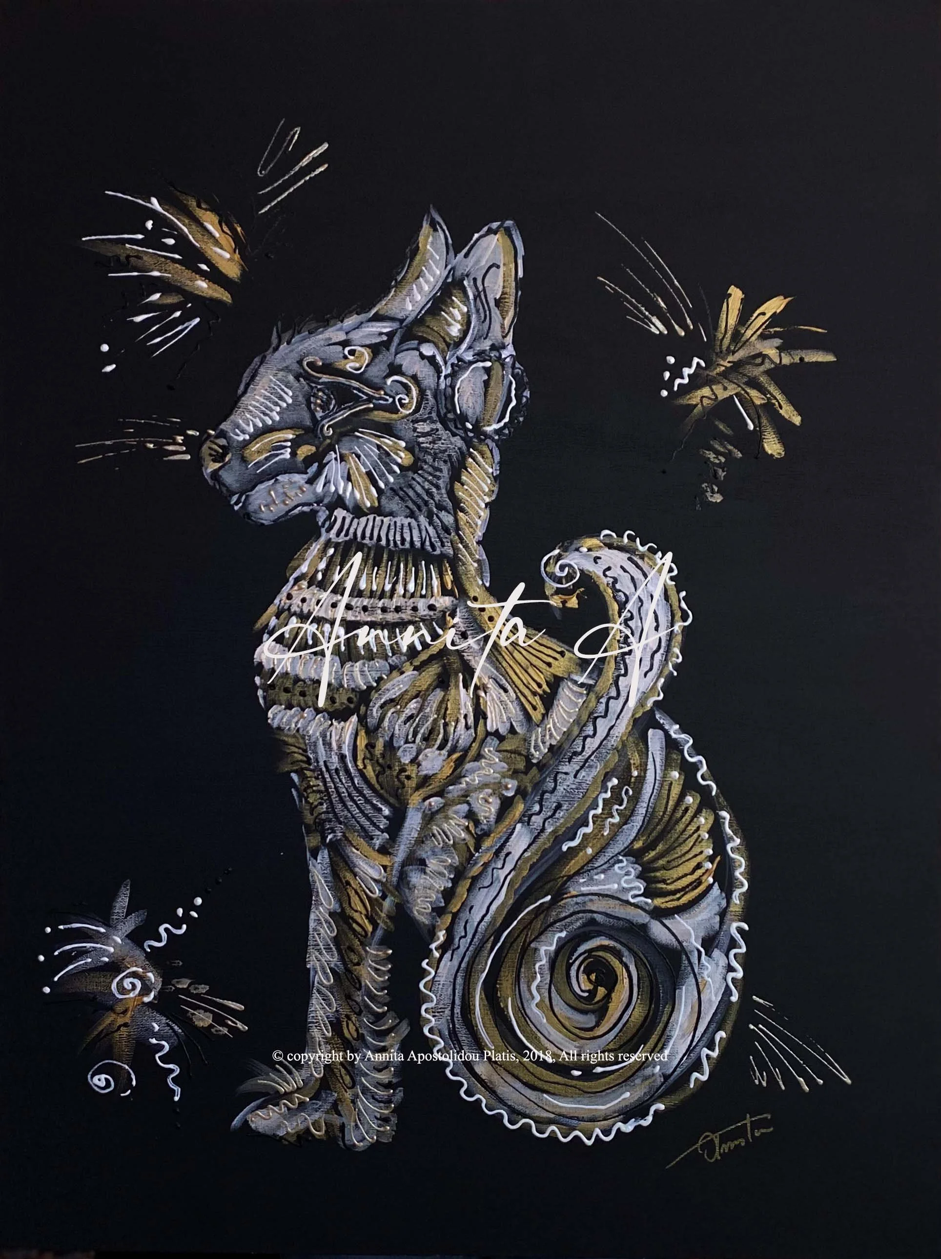 Σε μαύρο καμβά, απεικονίζω μια γάτα σε βασιλική στάση που θυμίζει αιγυπτιακή βασιλική οικογένεια, με χρώματα χρυσού, λευκού, γκρι και μαύρου. Η γούνα και το δέρμα είναι περίπλοκα διακοσμημένα με διακοσμητικά αφηρημένα σχέδια, αντηχώντας τα ιστορικά στολίδια των ιερών γατών. Η χρήση ακρυλικών και ειδικών τεχνικών τέχνης προσθέτει μια τρισδιάστατη υφή που φέρνει τη γάτα στη ζωή, κάνοντάς την να φαίνεται σαν να μπορούσε να βγει από τον καμβά στον κόσμο του θεατή.