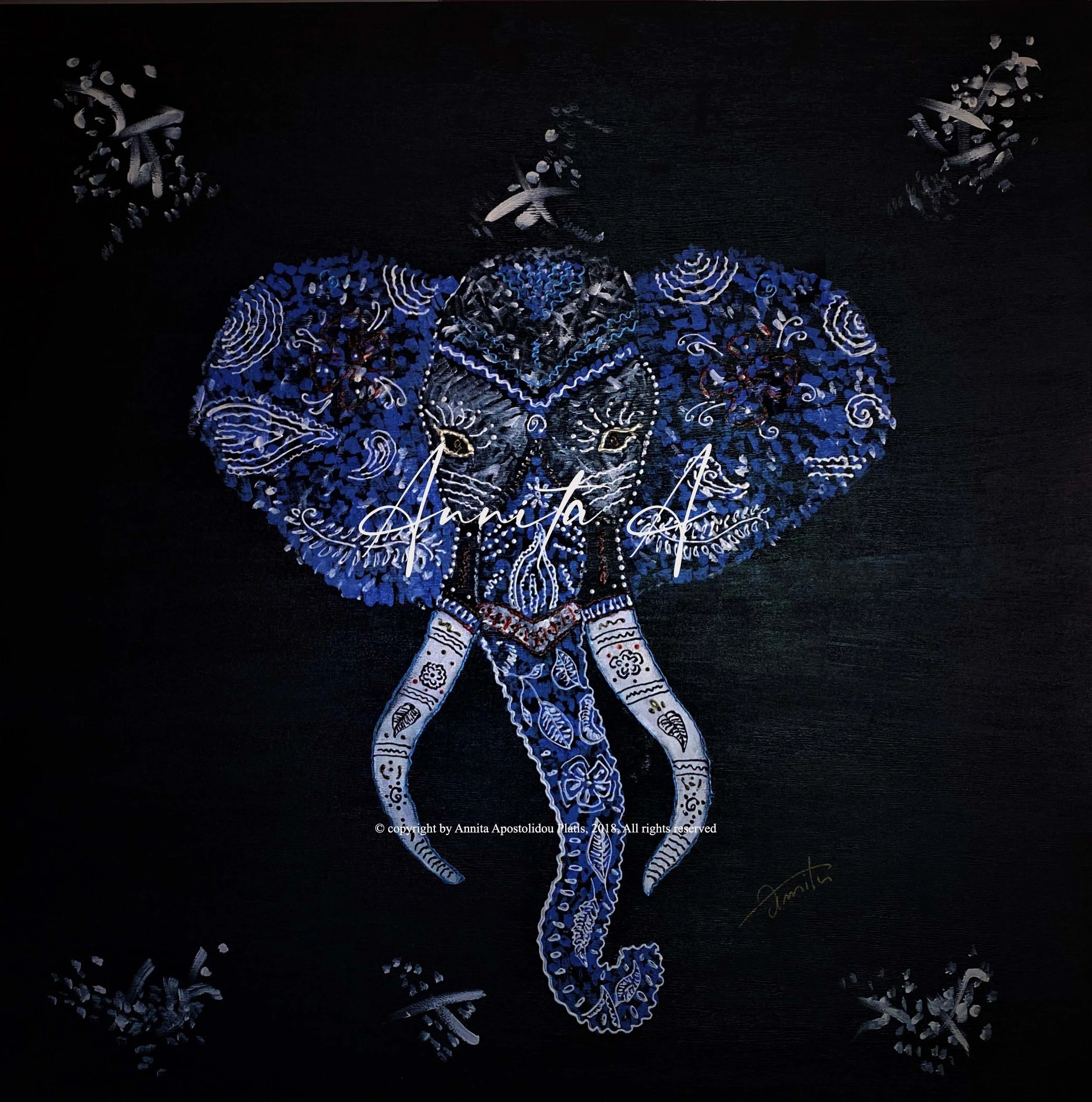 Στο έργο μου " στόχοι και όνειρα", συλλαμβάνω τη βαθιά ουσία του ελέφαντα, ένα σύμβολο εστιασμένης δύναμης, σοφίας και βαθιών οικογενειακών δεσμών. Αυτό το έργο τέχνης γιορτάζει το ρόλο του ελέφαντα ως φύλακα της αρχαίας γνώσης και οδηγό μέσα από τις μεταφυσικές και κοσμικές πτυχές της ζωής. Σε μαύρο καμβά, απεικονίζω το κεφάλι ενός ελέφαντα, ζωγραφισμένο σε εντυπωσιακές αποχρώσεις του λευκού και του μπλε, με περίπλοκα αφηρημένα σχέδια που αντιπροσωπεύουν το πλούσιο συμβολικό δέρμα του ζώου.