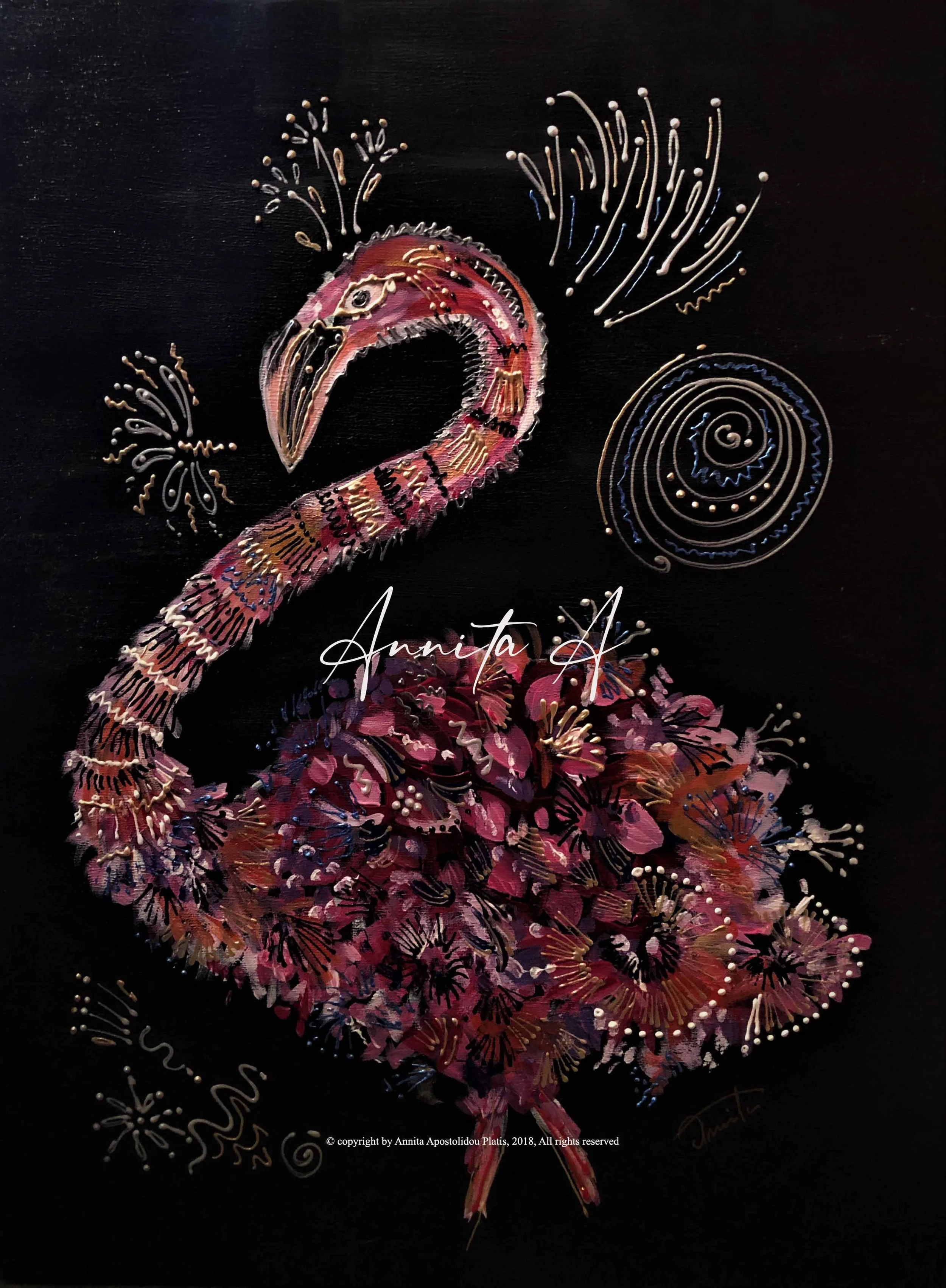 Τοποθετημένο σε μαύρο καμβά, το φλαμίνγκο απεικονίζεται σε μια παλέτα ροζ, λευκού, μοβ, μαύρου και Μπορντό, καταγράφοντας την εικονική και εντυπωσιακή εμφάνισή του. Η τεχνική ανακούφισης τέχνης δίνει μια τρισδιάστατη ποιότητα στα φτερά του φλαμίνγκο, διακοσμημένα με αφηρημένα σχέδια που μεταφέρουν μια βασιλική και ισχυρή αύρα. Αυτή η τεχνική, μαζί με τη χρήση γκλίτερ και μεταλλικών στυλό, προσθέτει ένταση και βάθος, κάνοντας το φλαμίνγκο να φαίνεται σχεδόν ζωντανό και παλλόμενο με ενέργεια.