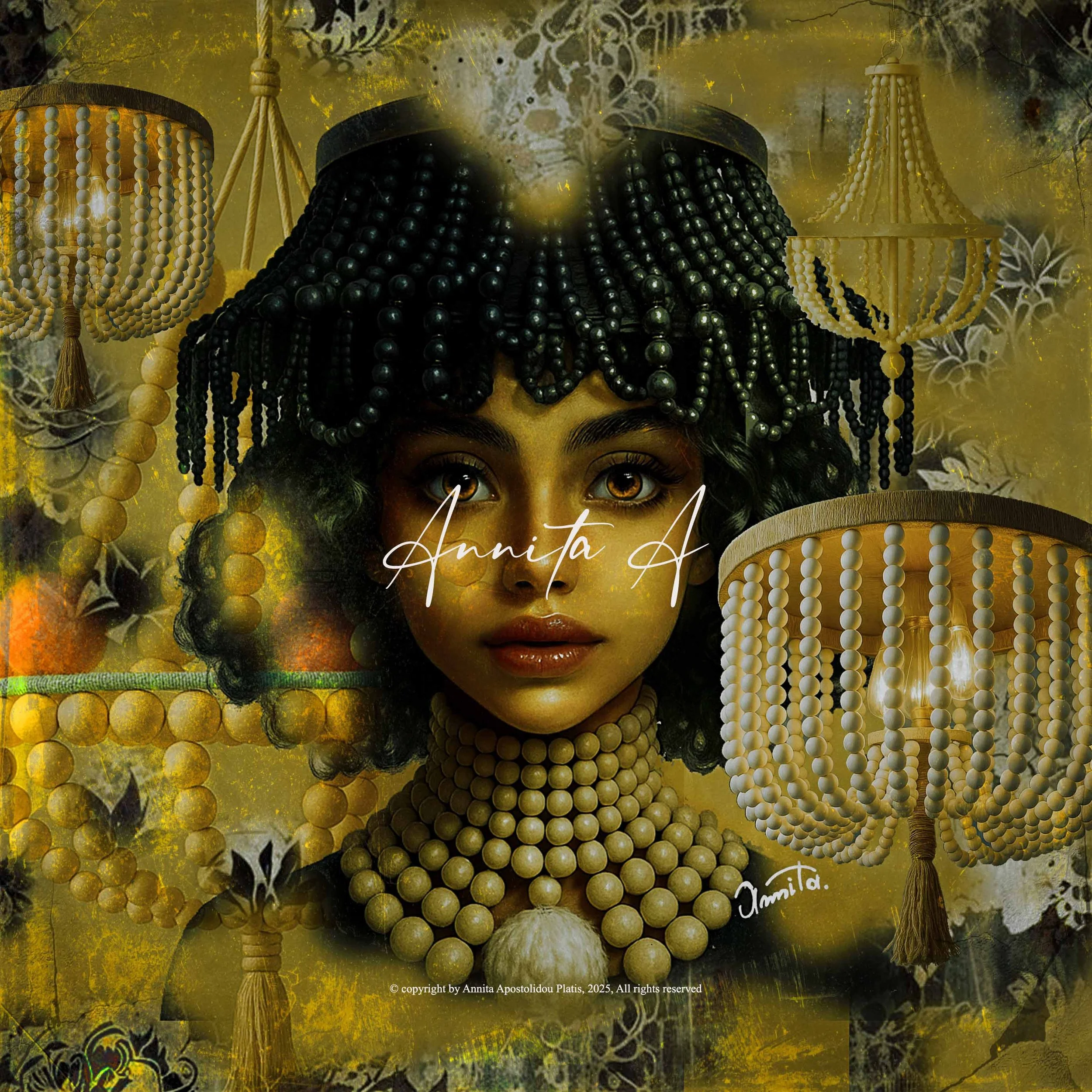 Ένα σουρεαλιστικό πορτρέτο ενδοσκόπησης και ήσυχης δύναμης, αυτό το έργο διερευνά τη δυαδικότητα του εσωτερικού φωτός και της εξωτερικής απόκρυψης. Η περίτεχνη κεφαλοστολή, που θυμίζει καπέλο φωτιστικού, συμβολίζει το πώς οι προσωπικές αλήθειες συχνά προστατεύονται από τη μνήμη, την ανθεκτικότητα και τον χρόνο. Περιβαλλόμενο από ρετρό φωτιστικά και κρόσσια, το έργο μετατρέπεται σε ένα ονειρικό τοπίο συναισθηματικού βάθους—εκεί όπου το φως δεν κραυγάζει, αλλά καθοδηγεί απαλά. Φτιαγμένο σε αποχρώσεις του πετρόλ, του χαλκού και του χρυσού, αποτελεί έναν φόρο τιμής στην ομορφιά όσων παραμένουν κρυμμένα, μα εξακολουθούν να ακτινοβολούν από μέσα.