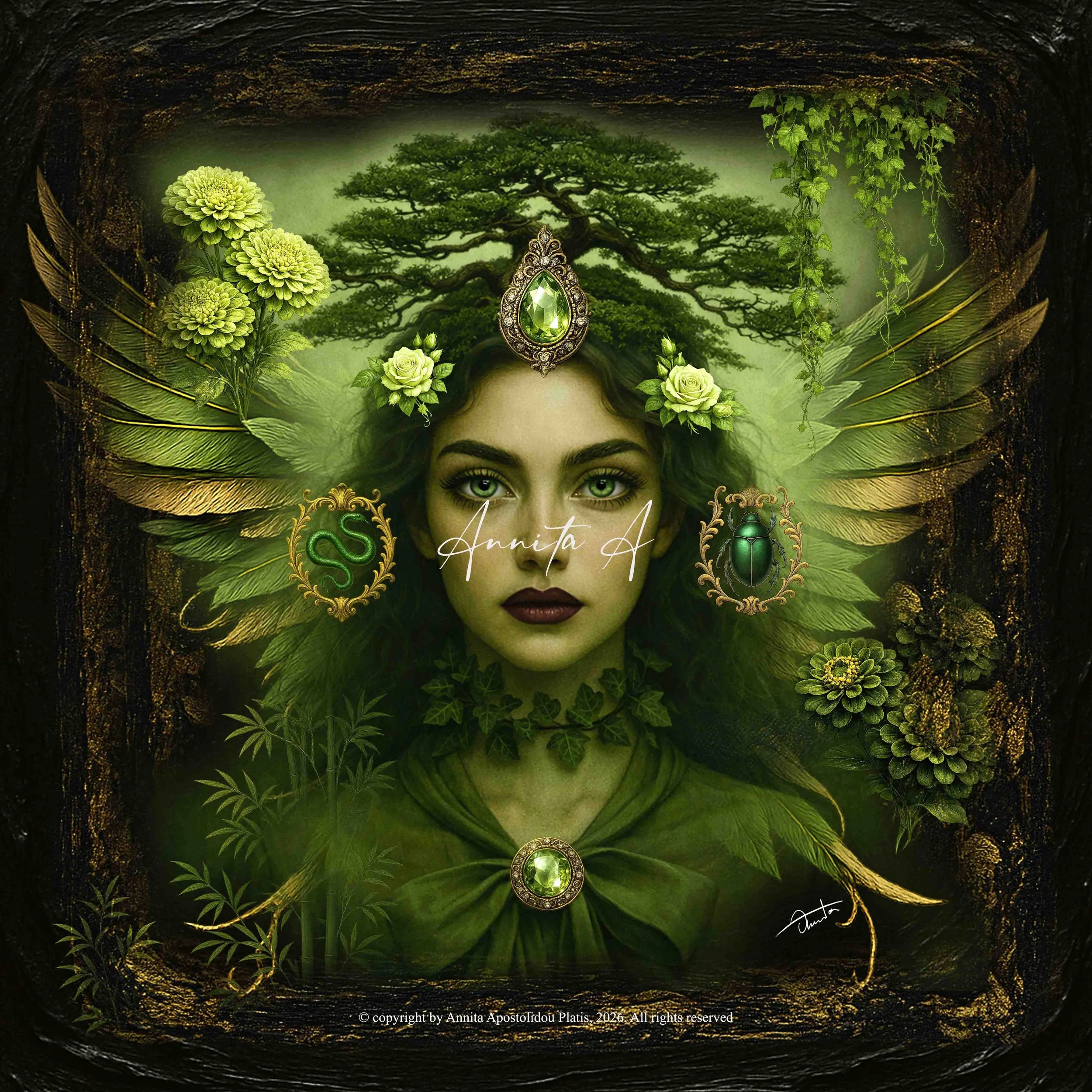 Η μορφή αναδύεται από ένα εσωτερικό τοπίο, όπου το μπονσάι υψώνεται σαν καλλιεργημένο στέμμα και τα χρυσάνθεμα, τα πράσινα τριαντάφυλλα, ο κισσός και οι ζίννιες σχηματίζουν έναν ζωντανό μανδύα. Παλαιού τύπου καρφίτσες με σχέδιο το φίδι και το σκαθάρι λειτουργούν ως εμβλήματα ανανέωσης και μεταμόρφωσης. Τα φτερά υποδηλώνουν επαγρύπνηση και άνοδο, παραμένοντας ωστόσο ριζωμένα στο φύλλωμα.
