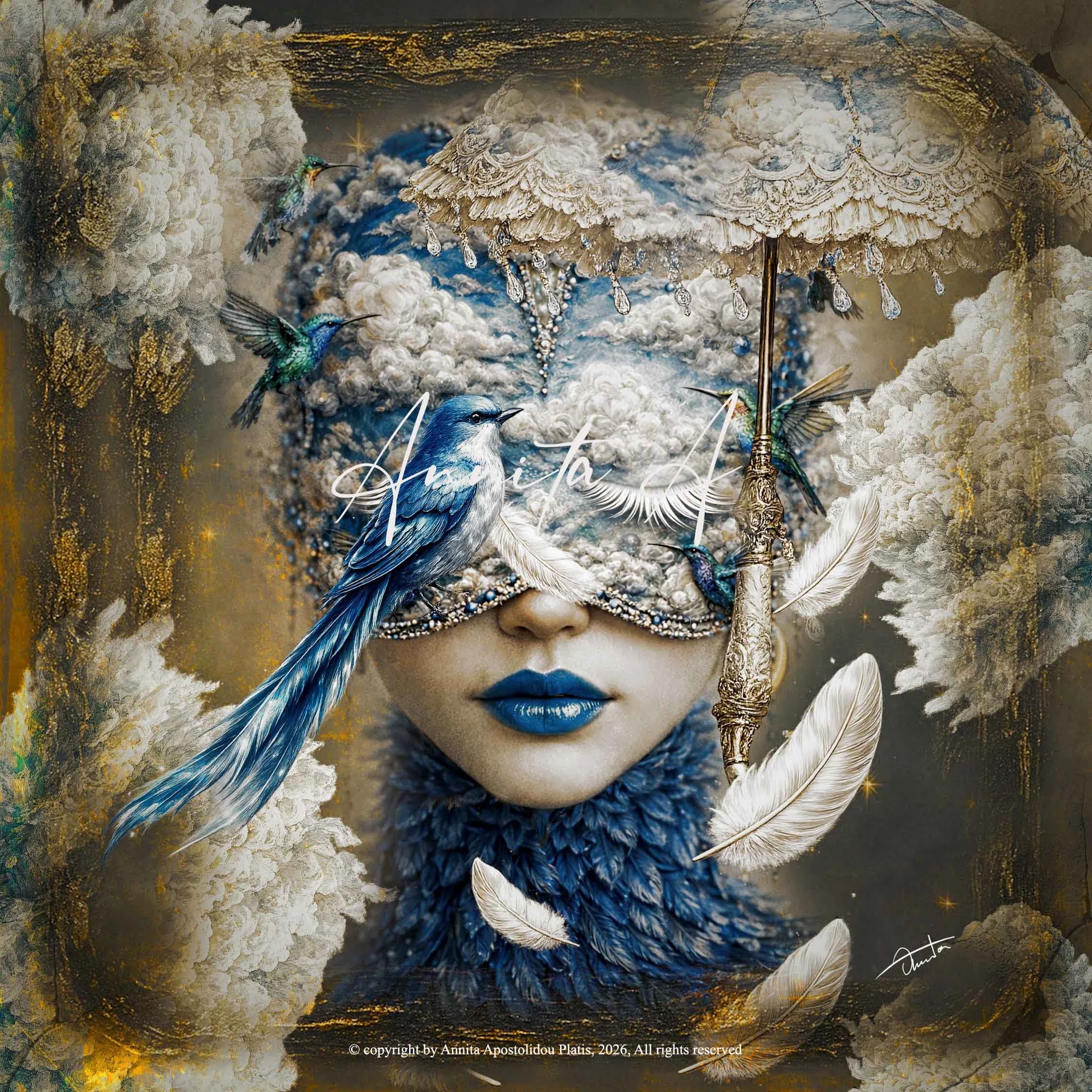 Ένα γαλάζιο πουλί ακουμπά απαλά στο καλυμμένο βλέμμα, συμβολίζοντας τη διαίσθηση αντί της λογικής, το ένστικτο αντί του υπολογισμού. Γύρω της, πουλιά κολίμπρι αιωρούνται σαν φευγαλέες σκέψεις, ενώ φτερά που πέφτουν παγώνουν τον χρόνο ανάμεσα στην άνοδο και την παράδοση. Η περίτεχνη ομπρέλα — στεφανωμένη με κρυστάλλινες σταγόνες — λειτουργεί ως καταφύγιο αλλά και ως ουράνιος άξονας, υποδηλώνοντας ότι η υπέρβαση δεν είναι διαφυγή, αλλά ευθυγράμμιση.