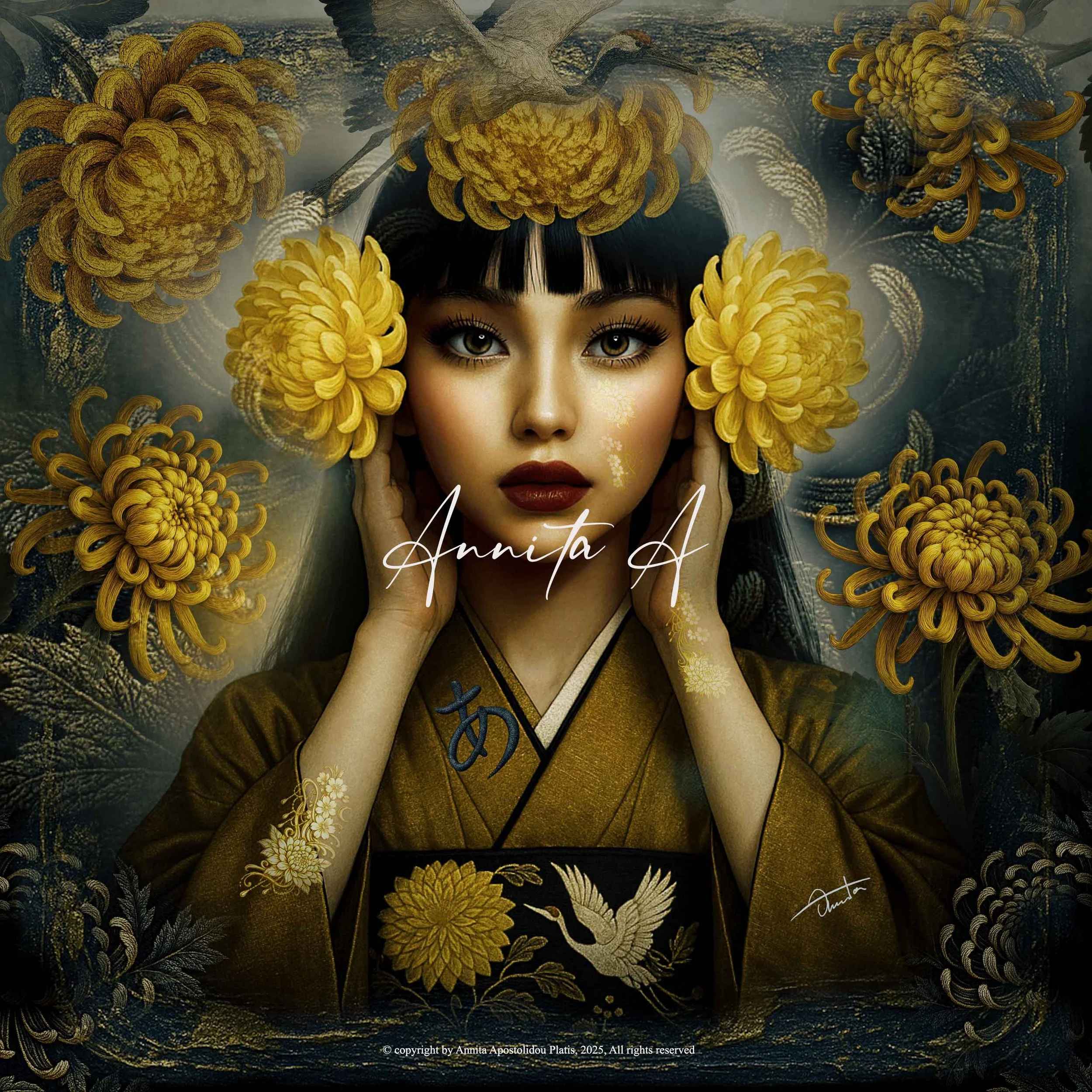 The chrysanthemums, symbols of endurance and rebirth, bloom with regal calmness. Embroidered on her kimono, a crane—messenger of grace and longevity—flies across a field of thread and memory. The monogram, stitched in indigo, is not merely signature but presence. The composition speaks in tones of vintage gold and soft quiet—like an heirloom held in the breath.