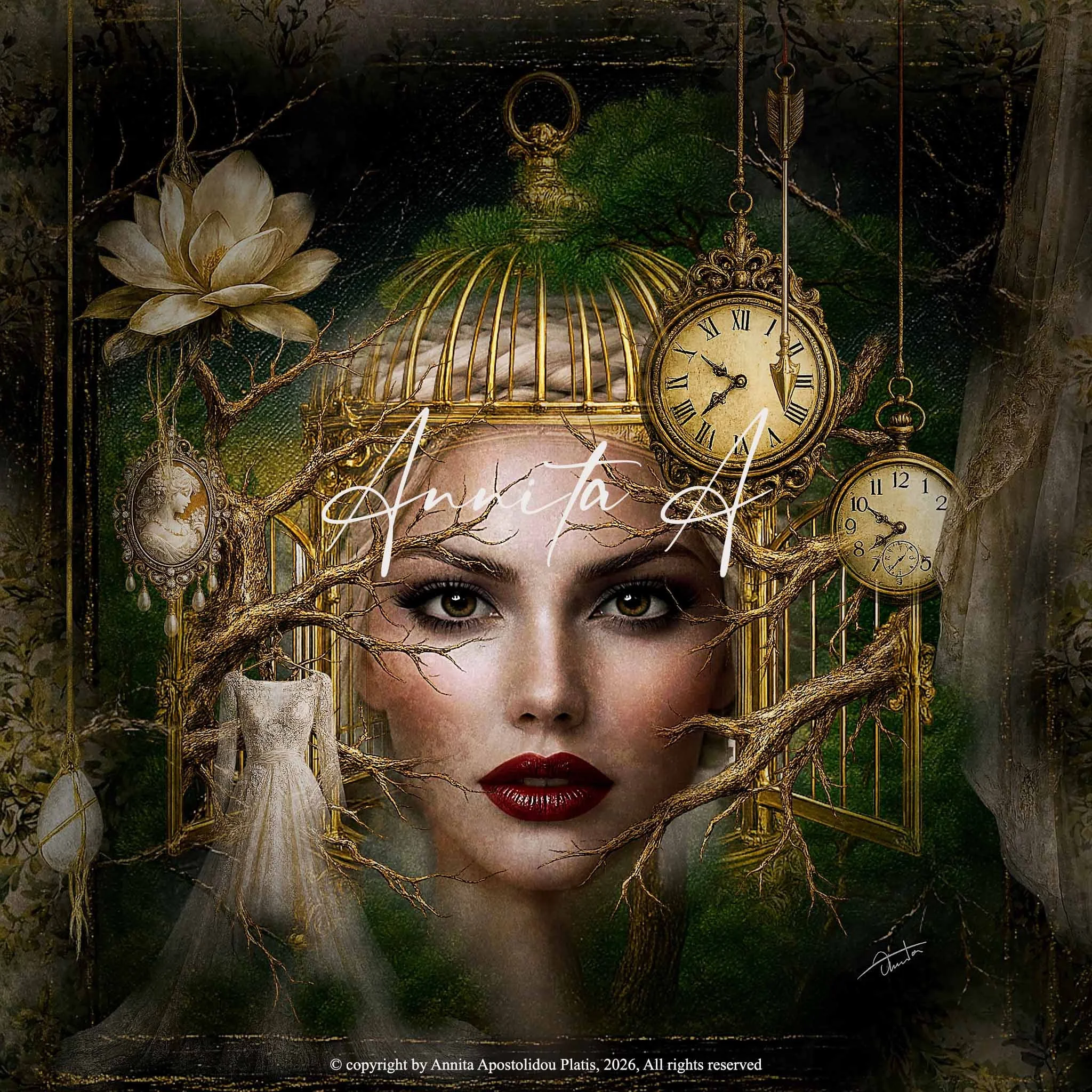 In this work, the human face becomes a landscape of inner nature. Branches grow across the portrait, symbolizing the obstacles and emotional complexities that shape our thoughts and actions. Behind the figure stands an open golden cage — a reminder that human confinement is often psychological, yet the door to freedom remains open if we choose to step through it.
